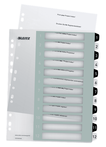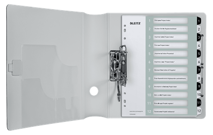 Wiederverwendbares, extra langlebiges Register in schwarz-weißer Kombination. Das A4-Deckblatt kann beliebig oft ausgetauscht und das Register so immer wieder verwendet werden.