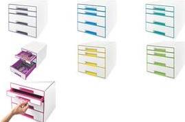 Auffällige WOW CUBE Schubladenbox in Premium-Qualität mit modernem zweifarbigem WOW Effekt in Hochglanz. Der robuste CUBE passt perfekt zu allen anderen Produkten der Leitz WOW Serie.