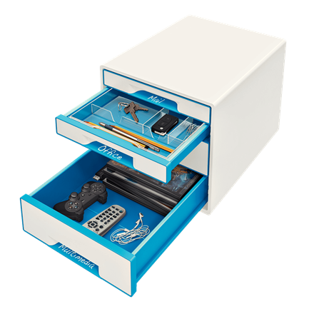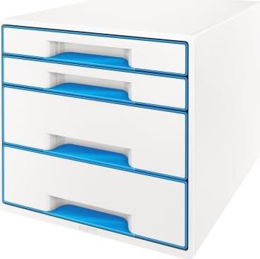 Esselte-Leitz LEITZ Schubladenbox WOW CUBE, 4 Schübe, perlweiß/blau für Format DIN A4 Maxi, Hochglanz, Schubladen mit Auszugs - 1 Stück (5213-20-36)