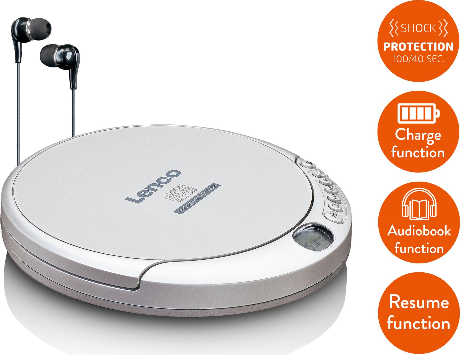 Der Lenco CD-201 ist ein praktischer tragbarer CD/MP3-Spieler mit 100 Sekunden Anti-Schock-Funktion. Er wird mit Kopfhörern und einem USB-Kabel ausgeliefert. Er verfügt über ein LCD-Display und einfach zu bedienende Tasten. Sind Sie oft unterwegs? Der tragbare CD-Spieler ist der perfekte Reisebegleiter. Mit dem Lenco CD-201 haben Sie Ihre Lieblingsmusik immer und überall dabei. Haben Sie es satt, sich Ihr Lieblingsalbum chronologisch anzuhören? Mit dem Lenco CD-201 ist es möglich, die Reihenfolge der Wiedergabe selbst zu bestimmen. Sie können den CD-Spieler entscheiden lassen, was das nächste Lied ist, oder selbst eine Reihenfolge programmieren. Zudem kann Ihr Lieblingslied aus dem Album mit der Wiederholungfunktion endlos angehört werden. Oder hören Sie sich Ihre ganz eigenen CD/MP3s an. Falls Sie ein Hörbuch oder Hörspiel hören bietet der Lenco CD-201 auch eine Hörbuch- bzw. Fortsetzungsfunktion, d.h. Sie können den CD-Spieler problemlos mitten im Hörbuch ausstellen und beim wieder einschalten dort weiterhören, wo sie aufgehört haben. Der Lenco CD-201 kann mit Batterien oder Akku-Batterien (nicht im Lieferumfang) betrieben werden, verfügt allerdings auch über eine Akkuladefunktion. Wenn der CD-Spieler mehr als 30 Sekunden lang keine Musik abspielt, schaltet er sich automatisch aus. Auf diese Weise sparen Sie Energie.