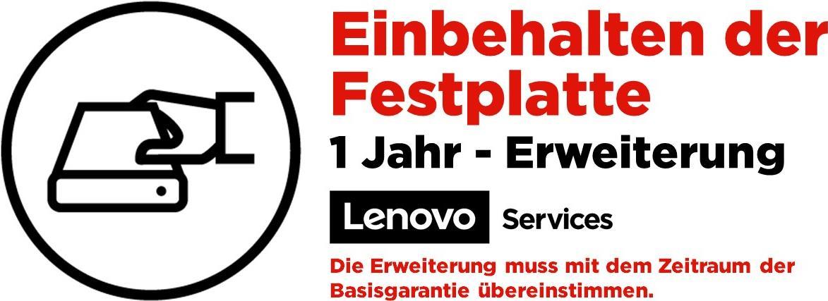 Lenovo™ Einbehalten der Festplatte 1 Jahre - Erweiterung (Keep Your Drive, KYD)Die Erweiterung muss mit dem Zeitraum der Basisgarantie übereinstimmenWENN IHNEN DATENSICHERHEIT WICHTIG ISTIhre Lenovo™ Festplatte und die darauf befindlichen Daten bleiben unter Ihrer Aufsicht, wodurch die Sicherheit optimiert und die möglichen Risiken der zivilrechtlichen Haftung gemindert werden. Mit dem Lenovo Service „Einbehalten der Festplatte“ (Keep Your Drive, KYD) können Sie Unternehmensdaten zu Ihren Bedingungen vernichten. (1)PLANBARE BUDGETSDer Service ermöglicht eine genaue Vorhersage der Anfangskosten, da die Reparatur der Festplatte entfällt.EINHALTUNG VON VORSCHRIFTEN UND REGULATORISCHER SCHUTZIhr Unternehmen kann die rechtlichen und finanziellen Folgen von Datensicherheitsverletzungen vermeiden.DATEN BLEIBEN GESCHÜTZTMacht die Nachverfolgung des Versandwegs defekter Festplatten überflüssig; IT-Mitarbeiter können sich auf wichtige Unternehmensaufgaben konzentrieren.Vorteile:• Der Service ist für Lenovo ThinkPad, ThinkCentre, ThinkStation und ausgewählte Lenovo/Idea Notebooks und Miix Produkte verfügbar.• Der Service „Einbehalten der Festplatte“ (KYD) muss gemeinsam mit dem System erworben werden. • Die Dauer des Schutzes entspricht der Dauer der Systemherstellergarantie, auch wenn die Festplatte ausgetauscht wurde. • Der Service gilt für mehrere Laufwerke in einem System und mehrere Fehler.• Der Service gilt sowohl für Solid-State-Laufwerke (SSD) als auch für Festplattenlaufwerke. Einige Modelle erfordern ein Upgrade auf einen Vor-Ort-Service, wenn die SSD auf die Systemplatine gelötet ist.Lenovo™ hat erstklassige Services im Programm, die Ihre PCs über den gesamten Lebenszyklus hinweg unterstützen.(1) Ein im Rahmen der Lenovo Herstellergarantie ausgetauschtes Teil geht in das Eigentum von Lenovo über. Alle Produkte und Angebote unterliegen der Verfügbarkeit.