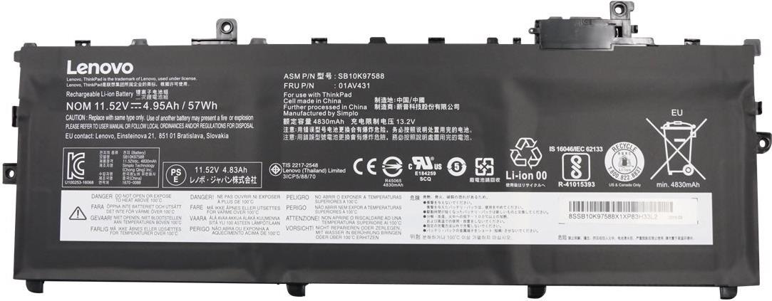 Lenovo Simplo - Laptop-Batterie - Lithium-Ionen - 3 Zellen - 4950 mAh - 57 Wh - FRU - für ThinkPad X1 Carbon (5th Gen) 20HR (01AV431)