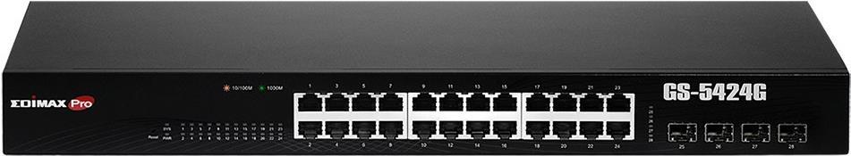 Der Edimax Pro GS-5424G Smart-Switch hat eine webbasierte Benutzeroberfläche, 24-Gigabit-Ports und 4 SFP-Ports für optische Anschlüsse. Somit können Multimodus- oder Einfachmodus-SFP-Module/-Transceiver zur Datenübertragung im Hochgeschwindigkeits-Gigabit und Langstreckenbereich eingesetzt werden. Mit intelligenten Funktionen wie SNMP v3, Dual Firmware, Voice VLAN, DHCP Snooping, QoS, CoS, STP, 802.1Q VLAN, IPv4/IPv6, Port Trunk, IGMP v1/v2/v3 Snooping und Mirror stellt er eine kostengünstige, skalierbare und sichere Switchlösung für SMB-Netzwerke dar. Der spezielle Long-Range-Modus von Edimax ermöglicht eine Strom- und Datenübertragung von bis zu 200 Metern bei einer Geschwindigkeit von 10 Mbit/s und eignet sich dadurch ideal für IP-Kameras und Anwendungen mit weit entfernten Netzwerkgeräten. Der Edimax GS-5424G ist die ideale Lösung zum Erhöhen der Entfernung/Geschwindigkeit für Netzwerkserver- und Backbone-Verbindungen.