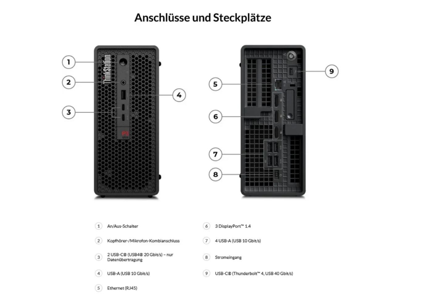 Rückanschlüsse 4x USB-A (10Gbps), 3x DisplayPort 1.4, 1x Ethernet (GbE RJ-45)