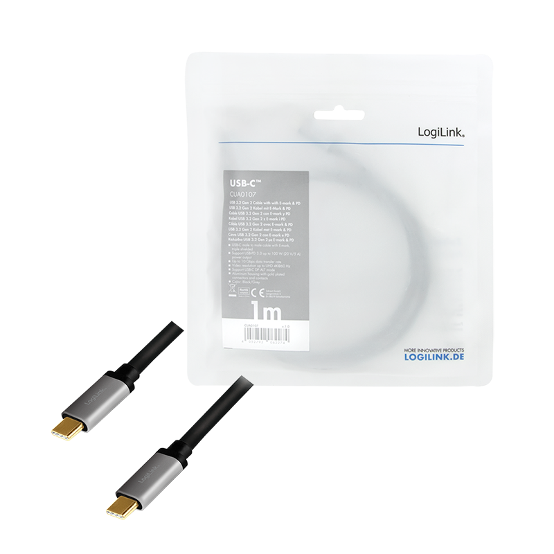 Logilink - USB-Kabel - 24 pin USB-C (M) zu 24 pin USB-C (M) - USB 3.2 Gen 2 - 20 V - 5 A - 1 m - Support von 4K 60 Hz - Schwarz (CUA0107)