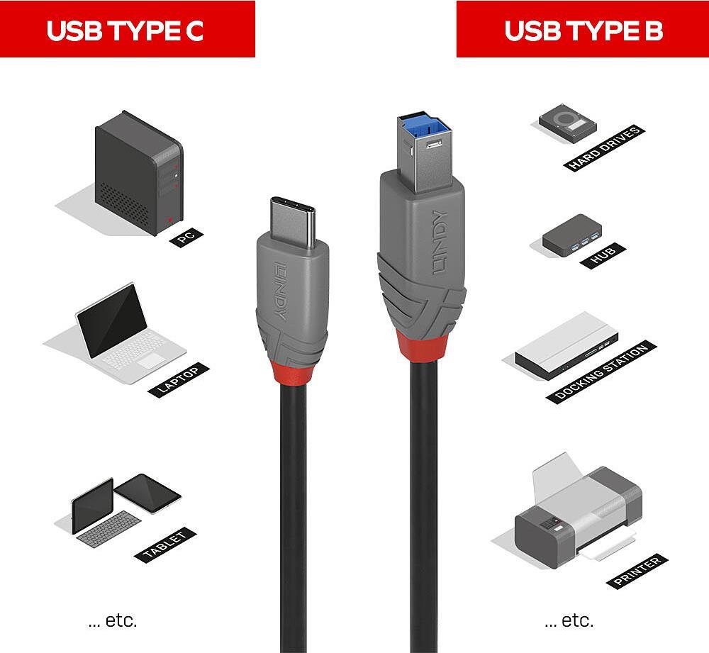 Lindy Anthra Line - USB-Kabel - USB-C (M) zu USB Type B (M) - USB 3,2 Gen 1 - 50cm - rund, bi-direktional - Schwarz (36665)