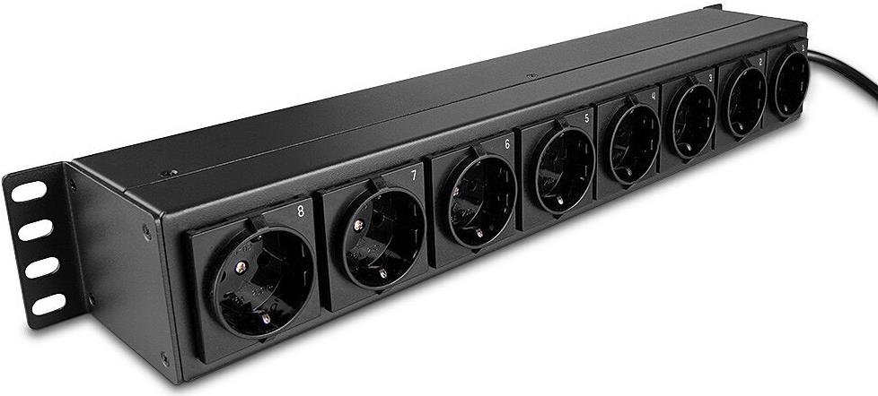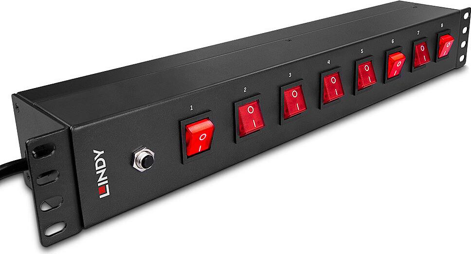 LINDY - Steckdosenleiste (Rack - einbaufähig) - Schuko-Steckdosen, horizontal, mit Schalter - Wechselstrom 250 V - 3500 Watt - Eingabe, Eingang CEE 7/4 - Ausgangsanschlüsse: 8 (power CEE 7/3) - 1,5U - 48,3 cm (19") - 2,0m Schnur - Schwarz (73025)