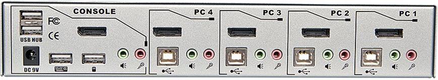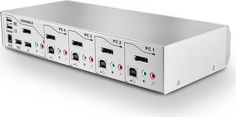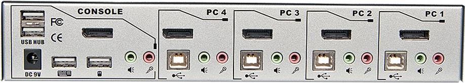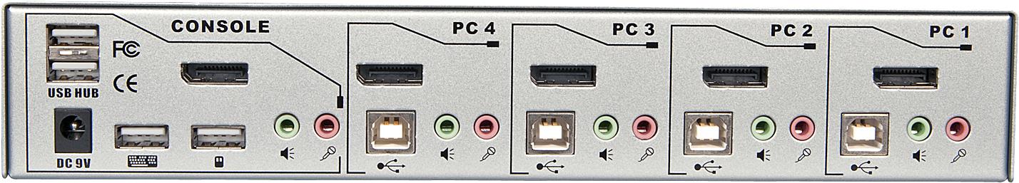 | Schnittstellen | 4 x DisplayPort-Eingang 4 x USB 2.0 - Type B 4 x Audioeingang - mini-jack 4 x Mikrofonausgang - mini-jack 1 x DisplayPort-Ausgang 2 x USB 2.0 - Type A 1 x Audioausgang - mini-jack 1 x Mikrofoneingang - mini-jack 1 x Tastatur (USB) - Type A 1 x Maus (USB) - Type A |