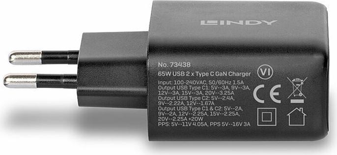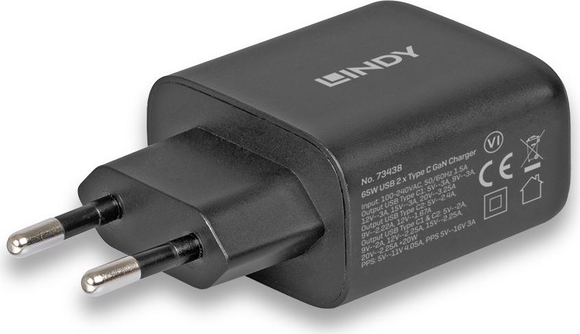 Lindy 65W USB 2 x Type C GaN Charger mit EU-Stecker (73438)