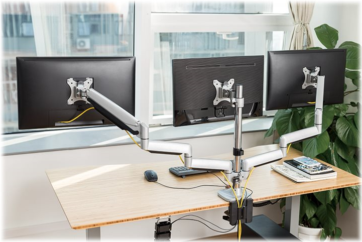 Befestigen Sie Ihren TV- und Computer-Monitor direkt am Schreibtisch. So können Sie auch dort Ihre Bildschirme mit voller Bewegungsfreiheit nutzen und sie nach Belieben neigen, schwenken oder drehen.