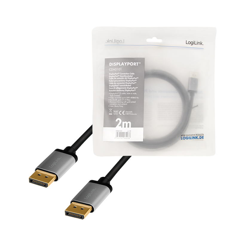 Logilink - DisplayPort-Kabel - DisplayPort (M) zu DisplayPort (M) - DisplayPort 1.2 - 2 m - 1080p-Unterstützung, Dolby DTS-HD Master Audio-Unterstützung, Dolby TrueHD-Unterstützung, Support von 4K 60 Hz, unterstützt 2K 165 Hz (2560 x 1440) - Grau, Schwarz (CDA0101)