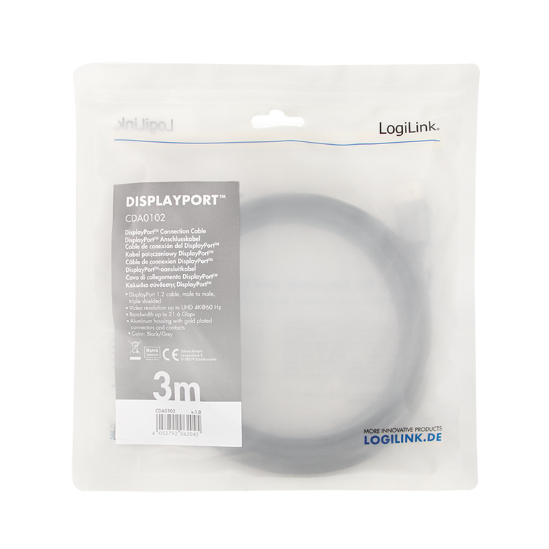 Logilink - DisplayPort-Kabel - DisplayPort (M) zu DisplayPort (M) - DisplayPort 1.2 - 3 m - Dolby DTS-HD Master Audio-Unterstützung, Dolby TrueHD-Unterstützung, Support von 4K 60 Hz - Schwarz (CDA0102)