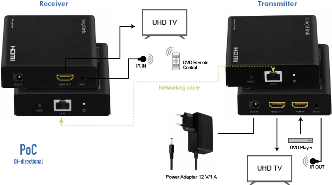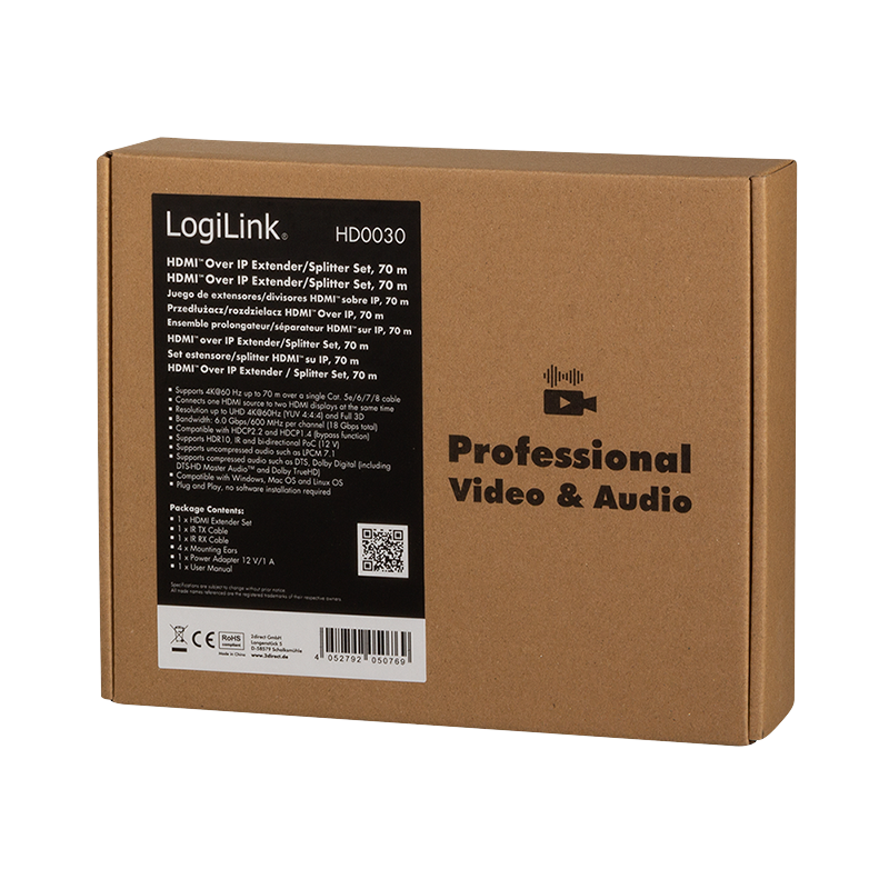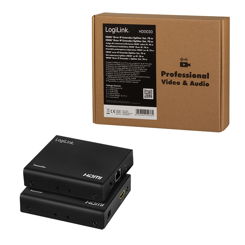 Das LogiLink Ultra HD HDMI Extender/Splitter-Set (Sende- & Empfangseinheit) bietet eine Extenderlösung über TCP/IP für allerhöchste Ansprüche und verteilt Audio- und Videosignale Ihres HDMI-Gerätes auf bis zu zwei Bildschirme, Fernseher oder Beamer. Es überträgt digitale Video- und Audiosignale auf eine maximale Länge von bis zu 70 m über ein einzelnes Cat.5e/6/7/8-Netzwerkkabel. Die höchste unterstütze Video-Auflösung liegt bei 4K/60 Hz. Mit Unterstützung von HDCP 1.4/2.2 (Bypass Funktion), HDR10, 3D sowie einer Audioübertragung in LPCM 7.1, DTS, Dolby Digital, DTS-HD Master Audio und Dolby TrueHD erleben Sie eine ultrascharfe Bildqualität. Über die bidirektionale Infrarot-Schnittstelle (Sender, Empfänger) können Sie die Fernbedienung der angeschlossenen Eingangsquelle verwenden. Die zusätzliche PoC-Funktionalität (Power over Cable) ermöglicht die Stromversorgung entfernter Geräte auch wenn dort keine externe Stromquelle zur Verfügung steht.