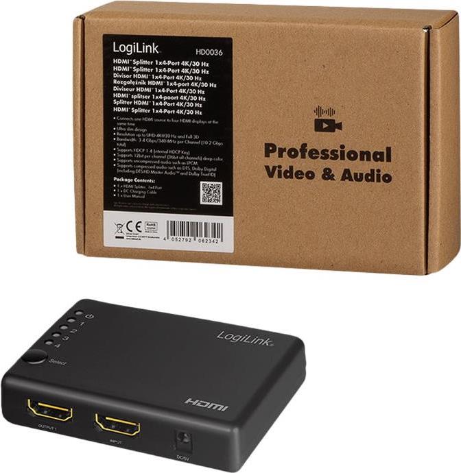 LogiLink HD0036 HDMI Splitter 1x4-Port, 4K/30 Hz, HDCP, CEC, slim (HD0036)