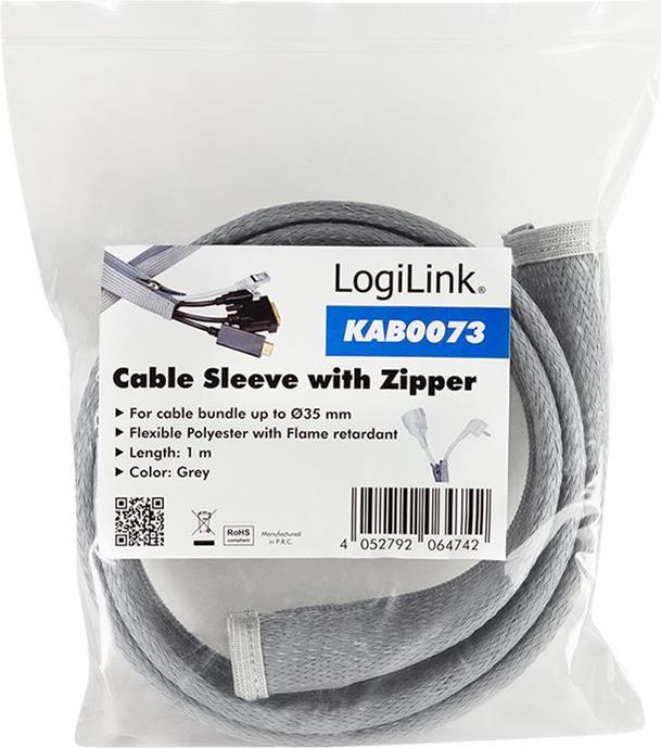 LogiLink Kabelschlauch mit Reißverschluss, 1,0 m, grau aus Polyester, abrieb-, zug- & formbeständgi, schlagfest, - 1 Stück (KAB0073)