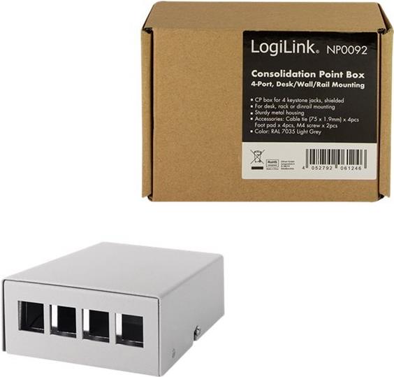 LogiLink Consolidation Point Box (CP) - Kabelanschlusskasten - Tisch montierbar, geeignet für Wandmontage, Schiene montierbar - Hellgrau, RAL 7035 - 4 Ports
