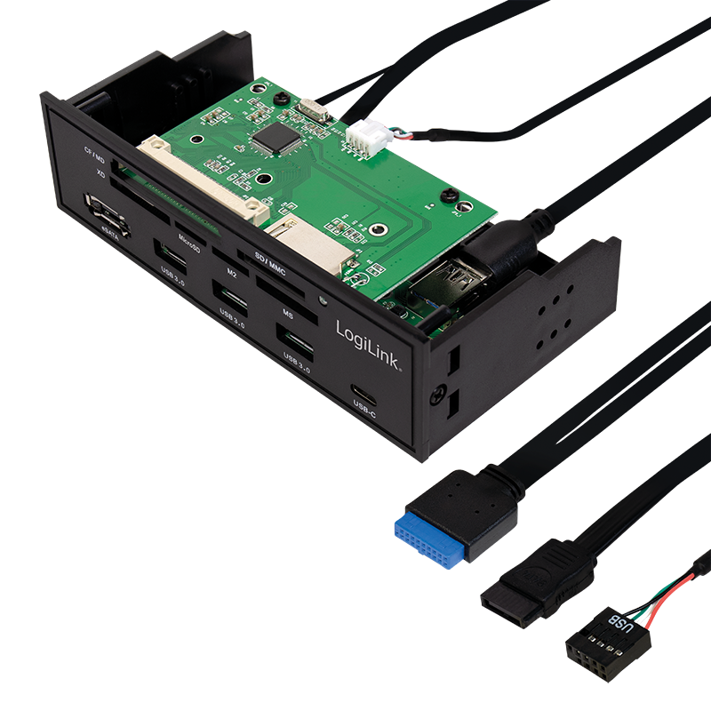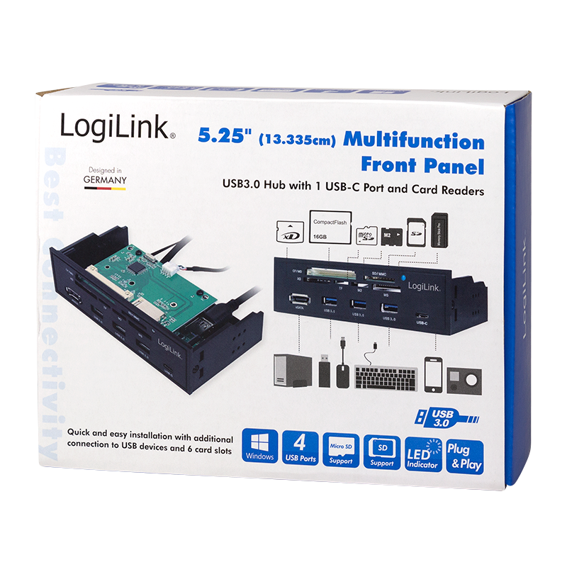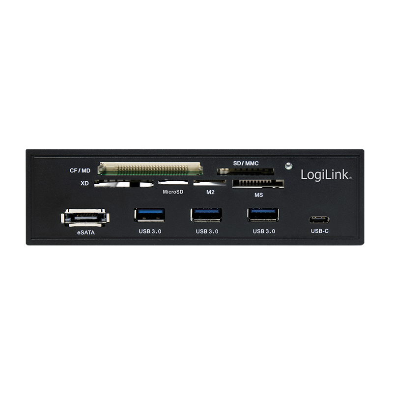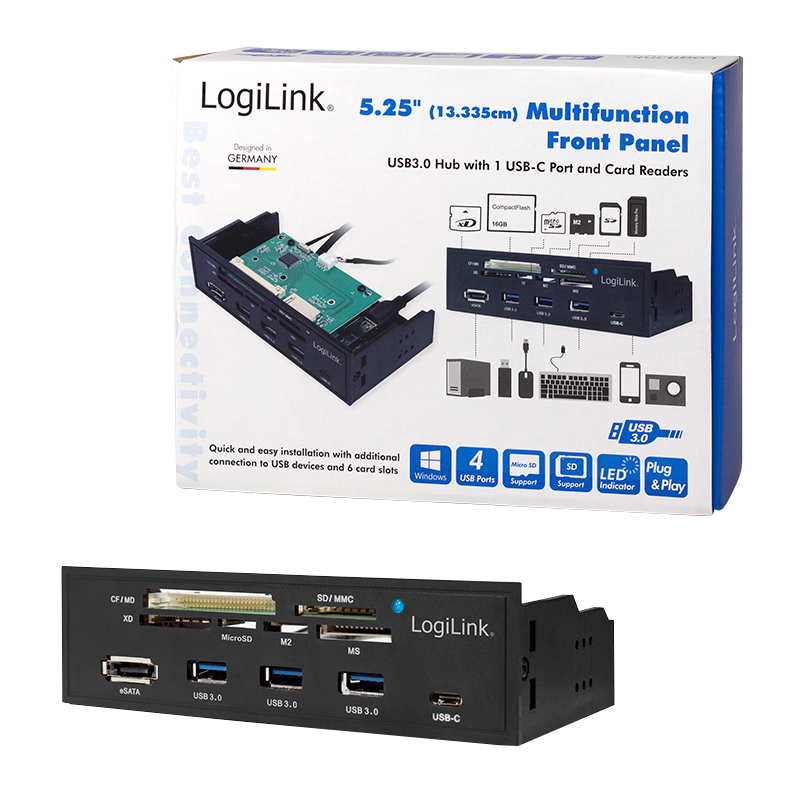 Mit dem Multifunktion-Panel von LogiLink können Sie Ihre Anschlussmöglichkeiten Ihres Computers schnell und einfach erweitern: 6 verschiedene Kartentypen können Sie nun in die entsprechenden Kartenschlitze stecken, wie etwa M2, MS, SD, microSD, XD oder CF Karten, und die Daten übertragen. Ebenso gibt es drei USB 3.0 Typ-A, einen USB Typ-C, sowie einen eSATA Port, an denen Sie nach Belieben Geräte anschließen können. Das Multifunktion-Panel kann einfach in die 5,25" große Frontplatte eines Computergehäuses montiert werden und bringt Ihnen so zusätzliche Anschlussmöglichkeiten.