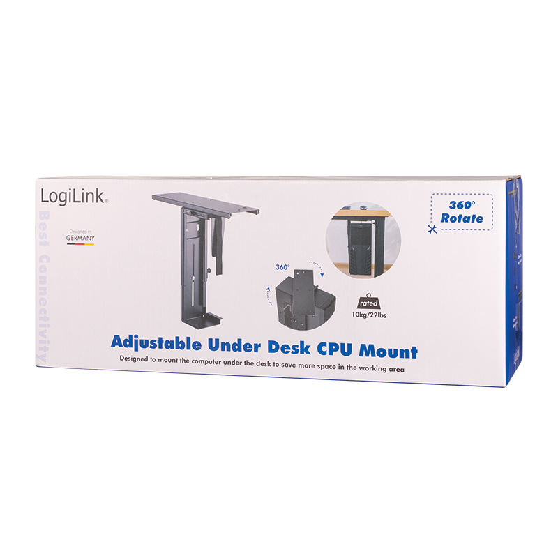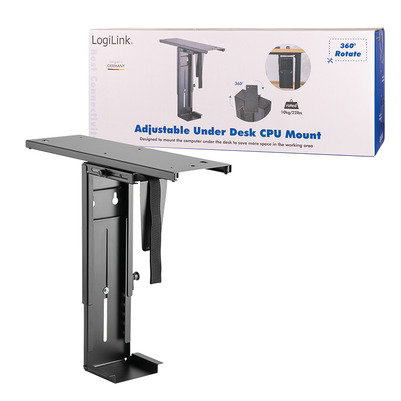 Konzipiert für die Montage des Computers unter dem Schreibtisch, um mehr Platz im Arbeitsbereich zu sparen und das Gerät weitestgehend vor Staub zu schützen. Durch den verstellbaren Haltearm, ist die Halterung für viele PCs geeignet und sorgt mit ihrer Drehbarkeit für ein Maximum an Flexibilität unter dem Schreibtisch.