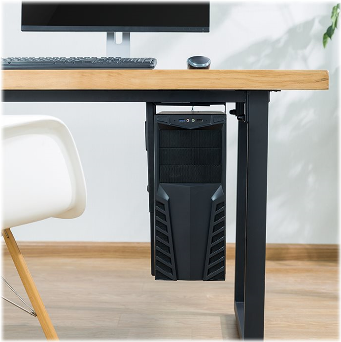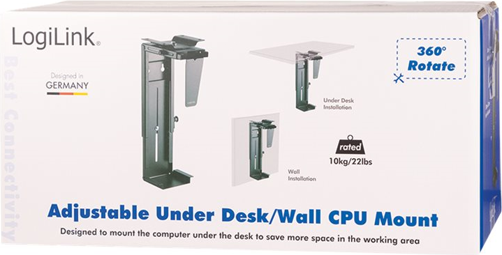 Konzipiert für die Montage des Computers unter dem Schreibtisch oder an der Wand, um mehr Platz im Arbeitsbereich zu sparen und das Gerät weitestgehend vor Staub zu schützen. Durch den verstellbaren Haltearm, ist die Halterung für viele PCs geeignet.