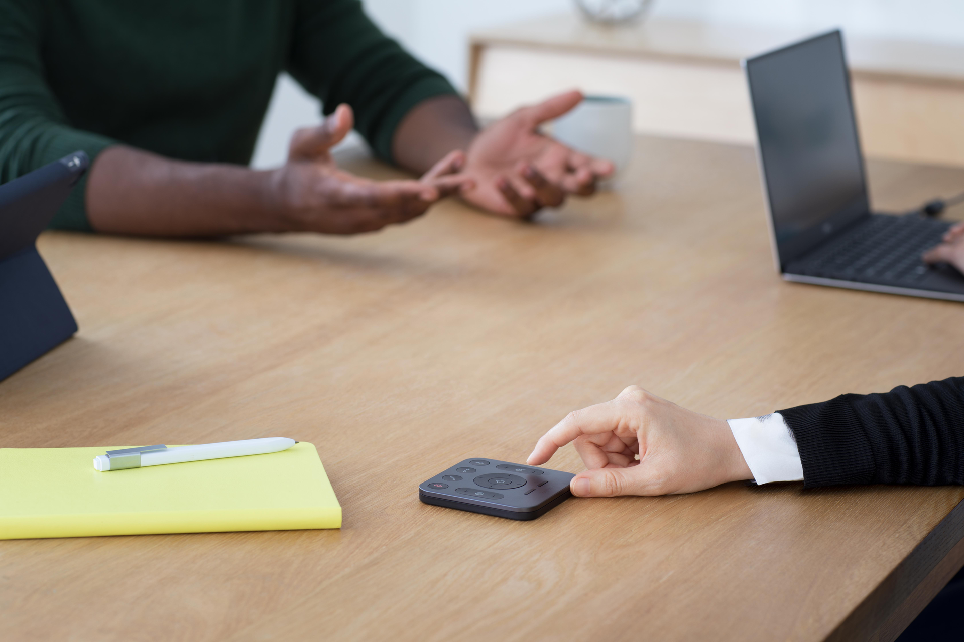 Die multidirektionale MeetUp Fernbedienung erlaubt ganz einfache Kamerasteuerung, Lautstärkeanpassung und Stummschaltung bzw. Aufheben der Stummschaltung von jeder beliebigen Position im Raum aus. Dank des praktischen Designs, den hochwertigen Materialien und der rutschfesten Grundfläche macht die MeetUp Fernbedienung sowohl auf dem Tisch als auch in Ihrer Hand eine gute Figur.