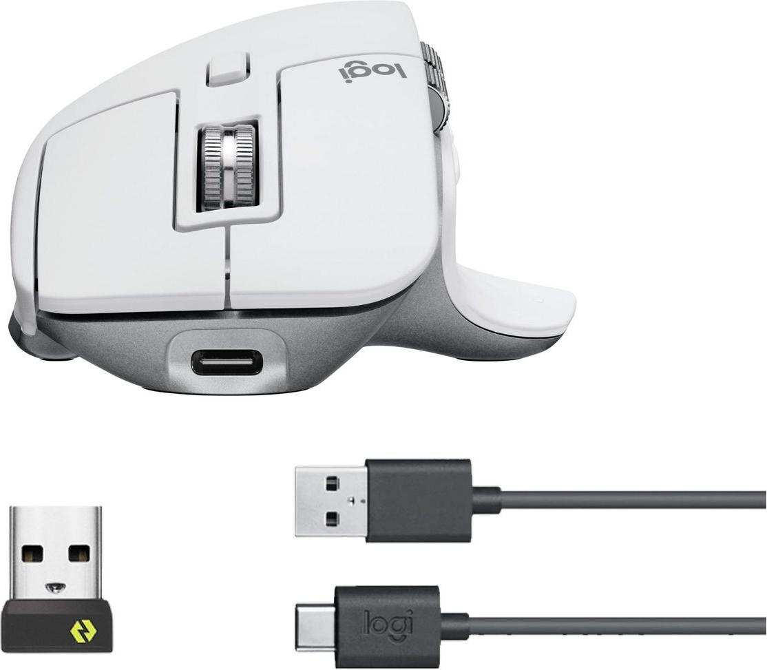 Logitech MX Master 3S. Formfaktor: rechts. Bewegungerfassungs Technologie: Laser, Geräteschnittstelle: RF Wireless + Bluetooth, Bewegung Auflösung: 8000 DPI, Tastentyp: Gedrückte Tasten, Knopfanzahl: 7, Scroll Typ: Rad. Energiequelle: Batterien. Produktfarbe: Silber, Weiß (910-006558)