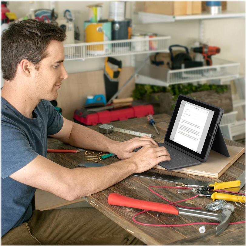 Rugged Folio für iPad (7. und 8. Generation) ist ein schlankes Tastatur-Case mit extremer Sturzfestigkeit: besser als Military-Grade! Dank Smart Connector Technologie ist kein Pairing oder Aufladen erforderlich. Die hochleistungsfähigen Tasten sind gegen Spritzer und Schmutz versiegelt – ideal zum Arbeiten unterwegs. Die Tastatur in Standardgröße bietet eine vollständige Reihe iOS-Sondertasten, Schutz für die Vorder- und Rückseite des iPad und eine praktische Aufbewahrungsmöglichkeit für den Logitech Crayon oder Apple Pencil (1. Generation).