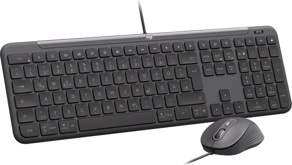 Mit mehreren Betriebssystemen kompatibles USB-C Tastatur-Maus-Set mit Notebook-ähnlichem Tippgefühl und beidhändig bedienbarer Maus für Arbeitsplätze, die eine kabelgebundene Verbindung erfordern.
