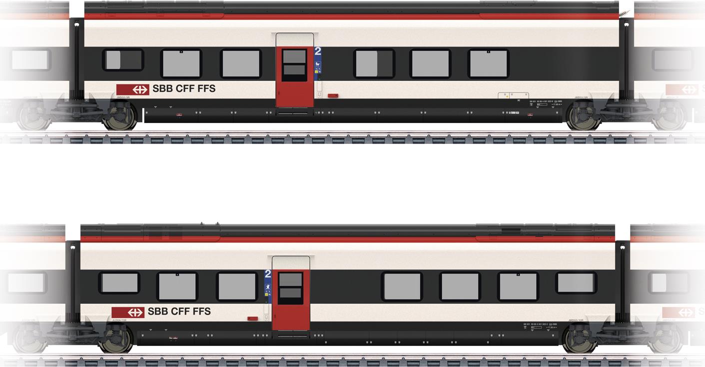 2-teiliges Ergänzungswagen-Set zur Erweiterung des Hochgeschwindigkeits-Triebzuges RABe 501 \"Giruno\" auf eine 11-teilige Einheit. Serienmäßig eingebaute Innenbeleuchtung mit wartungsfreien warmweißen Leuchtdioden ...