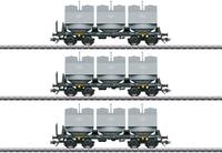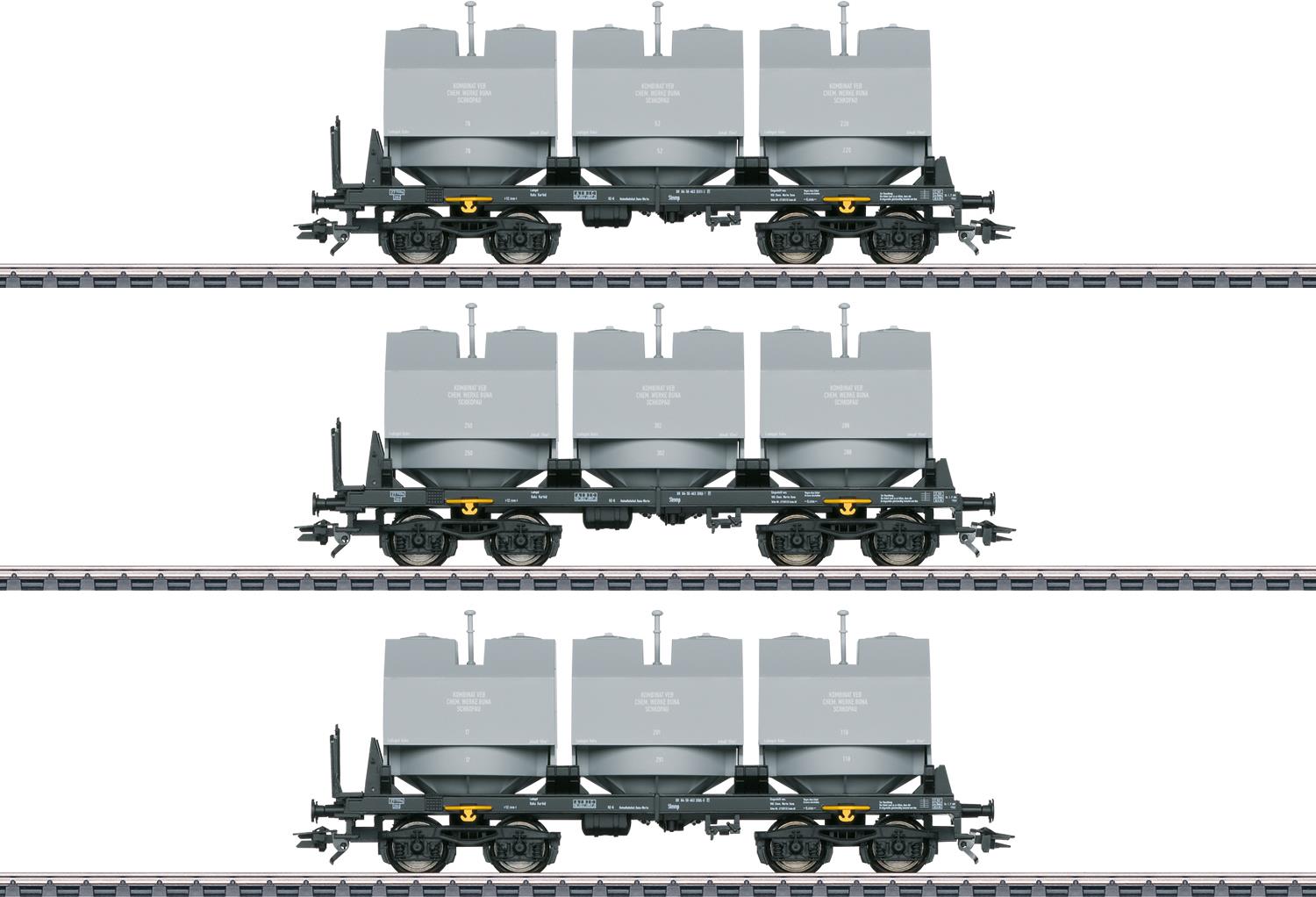 Vorbild: Drei vierachsige Kalkkübelwagen der Bauart Slmmp zum Transport nässeempfindlicher Schüttgüter. Schwarze Fahrwerke mit hellgrauen Kübeln. Privatwagen der VEB Chemische Werke Buna, Schkopau, eingestellt bei der ...