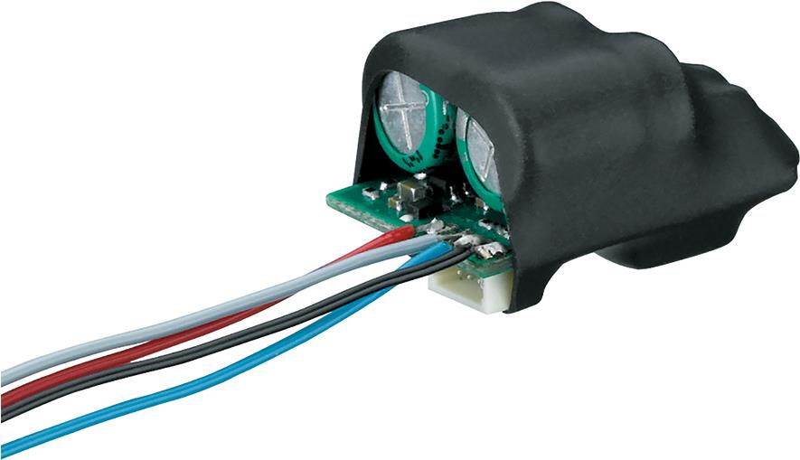 Leiterplatte mit 2 Pufferkondensatoren mit je 1 Farad zum Anschluss an die mLD3 und mSD3 mit den Artikelnummern 60972, 60975, 60976 und 60977. Der Pufferkondensator verhindert z.B. Lichtflackern und Soundaussetzer durch ...