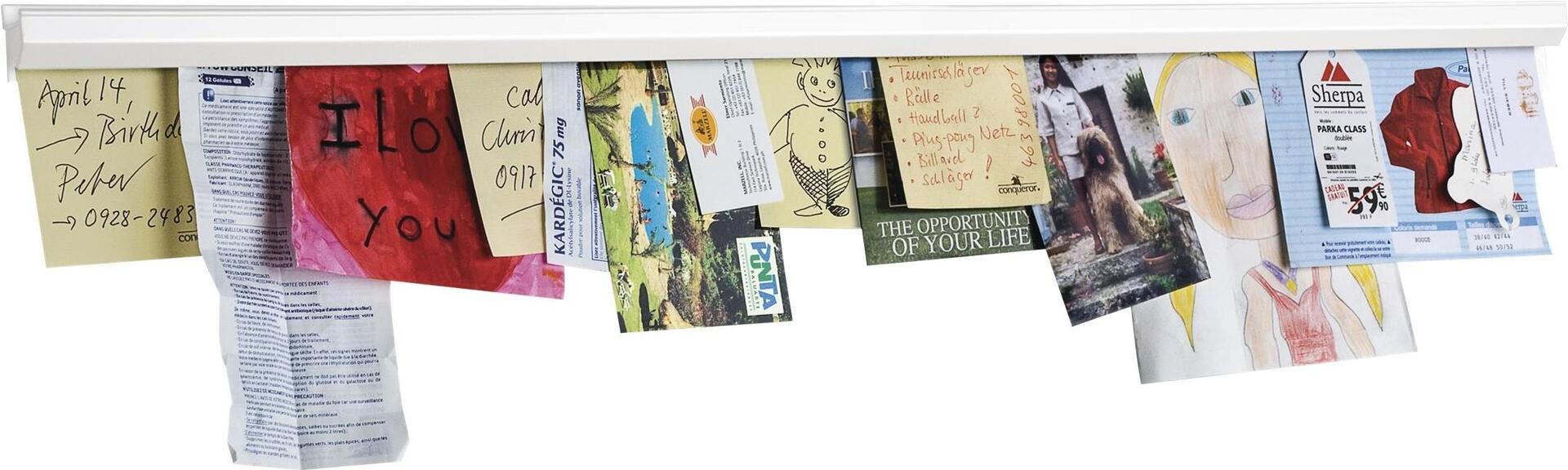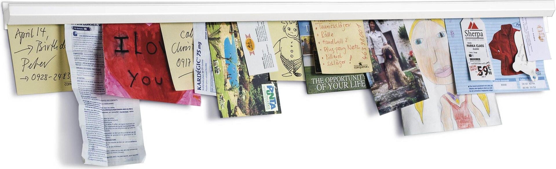Elegante, selbstklebende Klemmschienen aus eloxiertem Aluminium für Büro, Werkstatt etc. Zum schnellen, sicheren Befestigen von Notizen, Fotos, Plänen etc. Das Papier kann mit nur einer Hand fixiert + unbeschädigt wieder entnommen werden. Bis zu 30 Blatt Papier werden einfach von unten in die Schiene geklemmt. Die Kugeln aus technischem Glas halten die Papiere nur durch ihr Eigengewicht.Aie Schienen sind beliebig nebeneinander erweiterbarErhältlich in eloxiertemAluminium oder Kunststoff weiß, jeweils rückseitig selbstklebend oder auch mit Schrauben zu befestigenProdukttext[/head]magnetoplan Catch-Ball Aluminium-Klemmleiste, 1000 mm. Elegante Klemmschienen aus eloxiertem Aluminium für Büro, Werkstatt + Privatbereich. Zum schnellen, sicheren Befestigen von Notizen, Fotos, Plänen etc.: Das Papier kann mit nur einer Hand schnell fixiert und unbeschädigt wieder entnommen werdenBis zu 30 Blatt Papier werden einfach von unten in die Catch-Ball-Schiene geklemmtDie Kugeln aus technischem Glas in der Klemmschiene halten die Papiere sicher nur durch ihr EigengewichtDie Oberkante der Catch-Ball-Schiene dient zusätzlich als Ablagefläche für Bilder, Stifte etc.Die Schienen sind beliebig nebeneinander erweiterbarErhältlich in eloxiertem Aluminium oder Kunststoff weiß, jeweils rückseitig selbstklebend oder auch mit Schrauben zu befestigen.[head]Hauptmerkmale