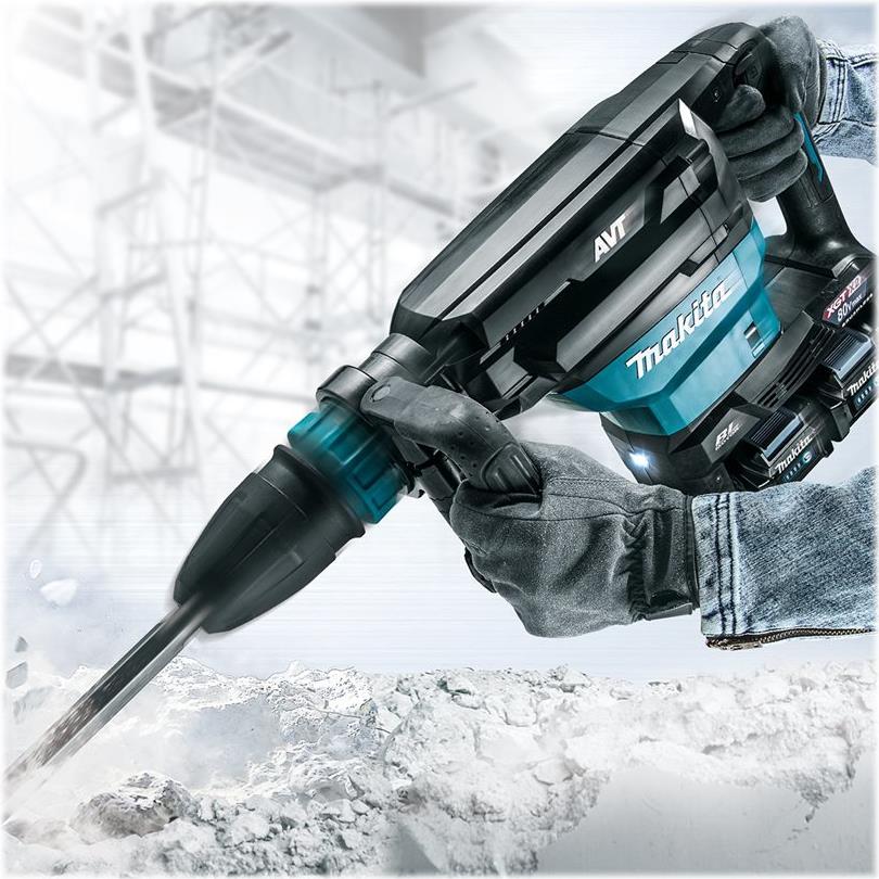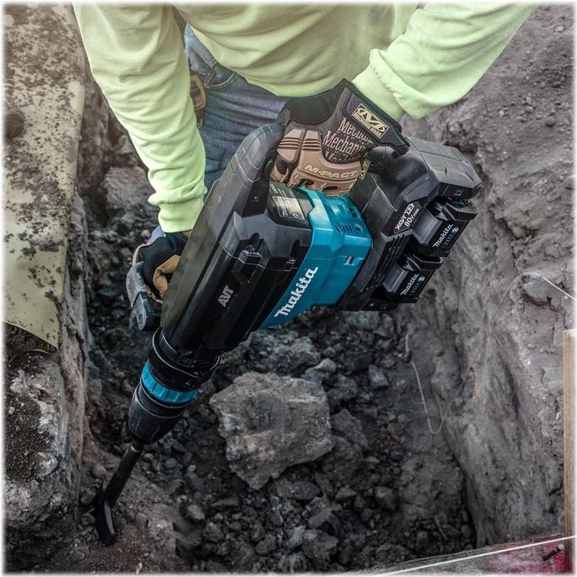 Trotz seiner hohen Schlagenergie ermöglicht der 2 x 40 V max. Akku-Stemmhammer HM002G dennoch ein vibrationsreduziertes Arbeiten. Zum einen verringert die bewährte Makita Anti-Vibration Technology (AVT) die Vibration der Maschine und reduziert so die Belastung beim Arbeiten. Zum anderen reduziert das SoftNoLoad-System die Motordrehzahl im Leerlauf. Dies senkt nicht nur den Energieverbrauch, sondern verringert ebenfalls die Vibration. So ist die Maschine bei Arbeitsunterbrechungen und beim Ansetzen besser zu kontrollieren. Der Seitengriff ist zudem schwingungsentkoppelt und ergonomisch günstig positioniert.
