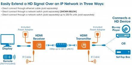 Das Manhattan 1080p HDMI über IP Extender Set ist die ideale Lösung, um praktisch jede digitale HDMI-Quelle (PlayStation, Xbox, Blu-ray Player, Satellitenempfänger, Digitalrekorder usw.) über ein IP-Netzwerk und ein einzelnes Netzwerkkabel mit einem HD-Display oder HD-Beamer über bis zu 120 m zu verbinden. Dieses mit Strom versorgte HMDI Extender Set ermöglicht eine zuverlässige 1080p-Video- und Mehrkanal-Audioübertragung über größere Entfernungen als mit HDMI-Kabeln. Darüber hinaus verfügen die Sender- und Empfängermodule über zusätzliche 3,5-mm-Anschlüsse für Infrarot (IR), was die Steuerung der Quelle vom Standort des Displays aus ermöglicht.