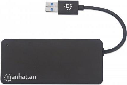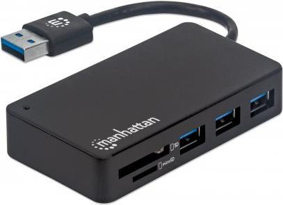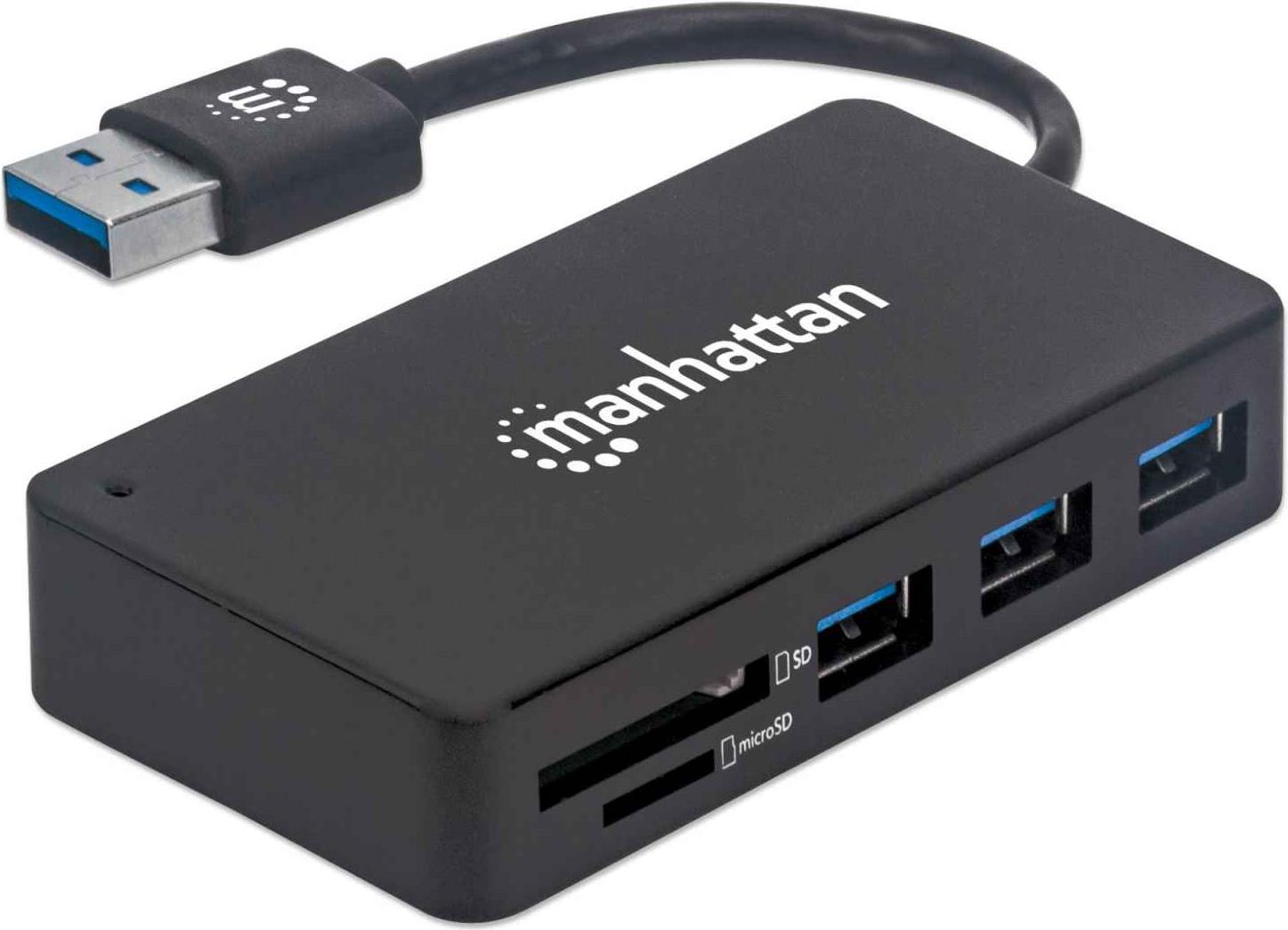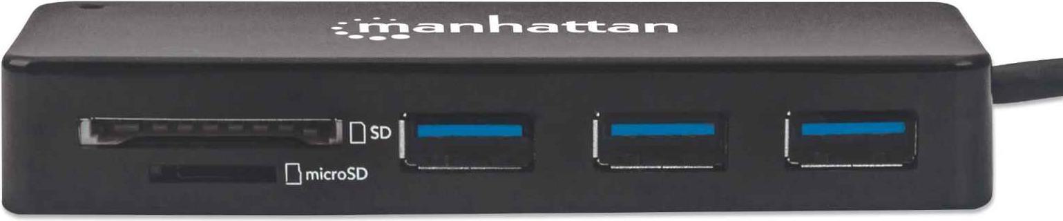Dieser Manhattan 3-Port USB 3.2 Gen 1 Hub mit Card Reader verdreifacht einen USB-A-Port zum Anschluss von Tastatur, Maus, USB-Drucker und vielem mehr. Der USB 3.2 Gen 1-Standard ermöglicht blitzschnelle Übertragungsraten bis zu 5 Gbit/s z. B. für externe Festplatten und USB-Sticks, ist aber auch abwärtskompatibel zu vorherigen USB-Standards. Mobile Geräte lassen sich mit 5 V/1 A laden. Der integrierte Card Reader liest sowohl SD- als auch MicroSD-Karten zum komfortablen Verwalten von Bildern und anderen Dateien.