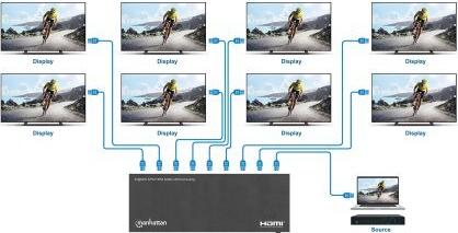Der IC Intracom Manhattan HDMI-Video-/Audio-Splitter wurde für eine Auflösung von 4K bei 60 Hz entwickelt und eignet sich daher für High-Definition-Anwendungen. Mit einer robusten 1 x 8-Matrix-Switch-Konfiguration ermöglicht dieses Gerät eine nahtlose Verkettung mit mehreren Displays und gewährleistet eine reibungslose Verteilung von Video- und Audiosignalen. Der Splitter unterstützt Funktionen wie Dolby TrueHD, DTS-HD Master Audio und LPCM 7.1 und bietet so ein beeindruckendes Klangerlebnis in Kombination mit Bildmaterial.