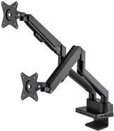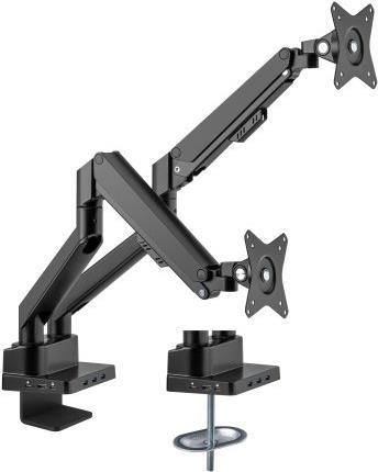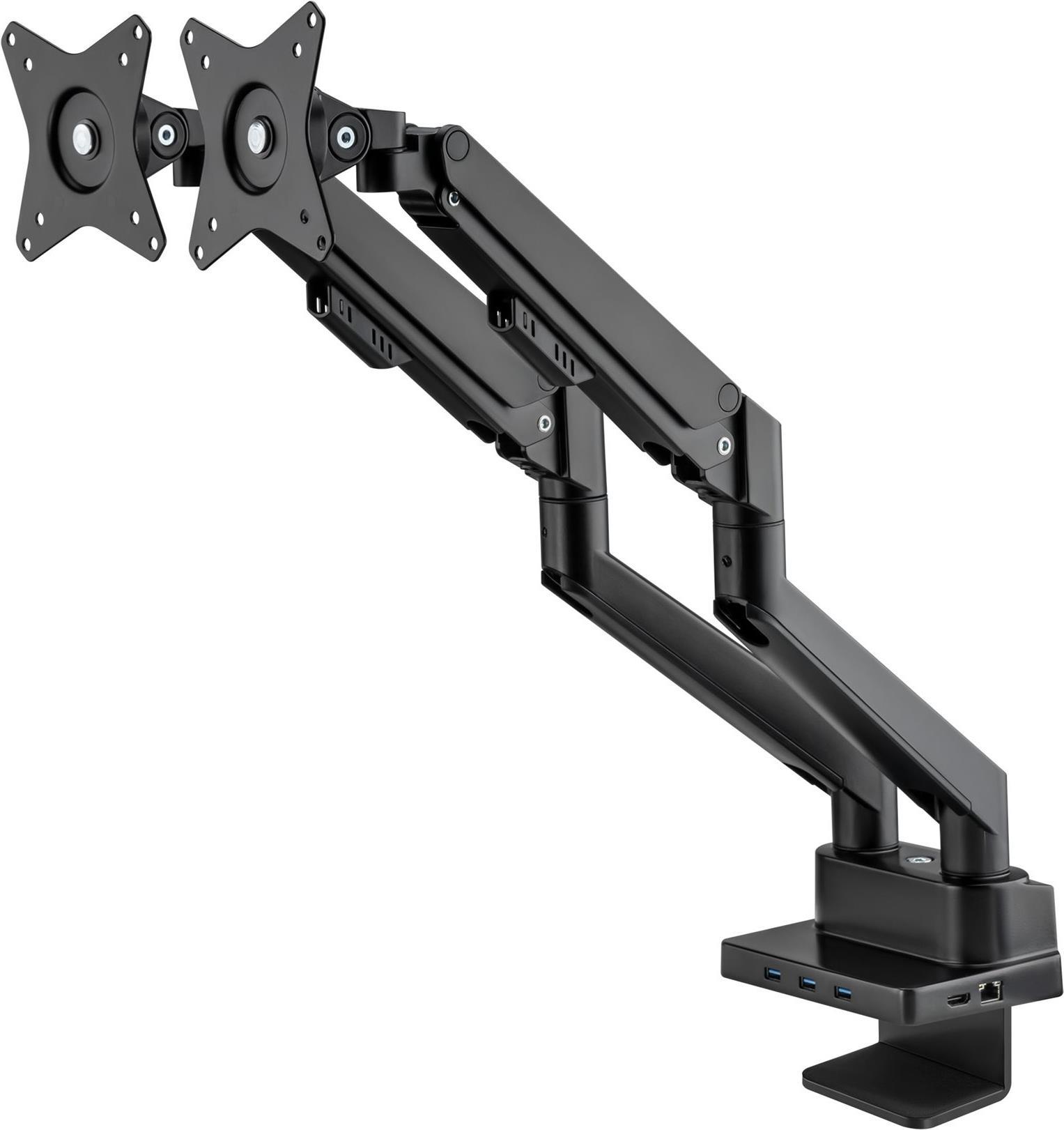 Verwandeln Sie Ihren (Home-)Office-Traumschreibtisch in eine ergonomische Realität und gewinnen Sie wertvollen Arbeitsraum zurück mit dieser kombinierten Monitorhalterung und Dockingstation von Manhattan. Da die Monitore mithilfe einer Gasfeder gehalten werden, genügt eine leichte Berührung, um die Bildschirme in den für Sie optimalen Blickwinkel zu bringen. Die VESA-Halterung für zwei Monitore unterstützt Bildschirme von 17\" bis 32\" mit einer Gewichtskapazität von jeweils bis zu 9 kg (19,8 lbs.). Die attraktive schwarze Oberfläche mit Pulverbeschichtung ergänzt Ihren Arbeitsbereich.Mit einem Gasfederzylinder lässt sich das Display ganz einfach in einem Bereich von 210 bis 490 mm anheben oder absenken, so dass es an der besten Stelle für Ihre Sichtlinie angebracht werden kann. Passen Sie die Spannung an das Gewicht Ihrer Monitore an, um sie mühelos neu zu positionieren.Die voll beweglichen Arme lassen sich in mehreren Achsen ausziehen, neigen und schwenken, so dass Sie ganz einfach einen ergonomischen Arbeitsplatz schaffen können, der genau Ihren Bedürfnissen entspricht. Sie können Ihre Monitore auch vom Quer- ins Hochformat drehen, um Fotos im Hochformat zu betrachten oder längere Seiten und Codeblöcke anzuzeigen, ohne nach unten scrollen zu müssen.Sie können die Halterung entweder an der Seite eines Schreibtisches, Tisches oder Tresens mit einer Dicke von 10 bis 50 mm befestigen oder sie durch eine 10 bis 50 mm breite Durchführungsöffnung montieren.
