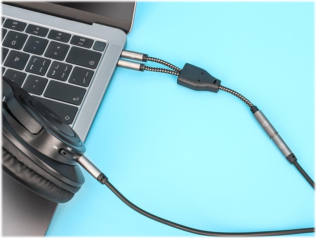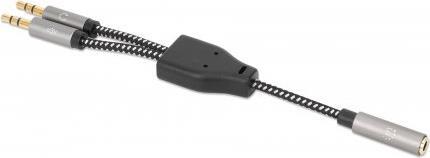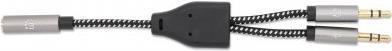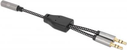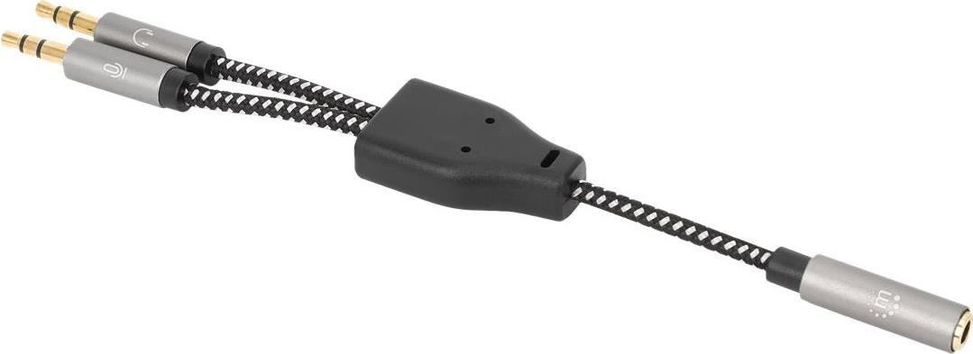 MANHATTAN Headset-Adapterkabel mit Aux Y-Audiosplitter 3,5 mm Klinkenbuchse auf 2 x 3,5 mm Klinkenstecker, 15 cm, teilt einzelnen Headsetstecker in Mikrofon und Audiostecker, CTIA, vergoldete Kontakte, geflochtene Nylonummantelung, schwarz/silber (356121)