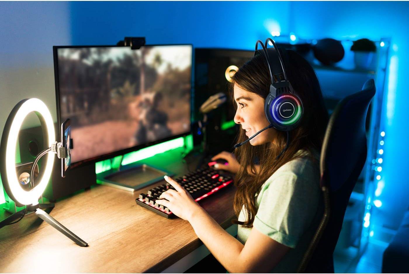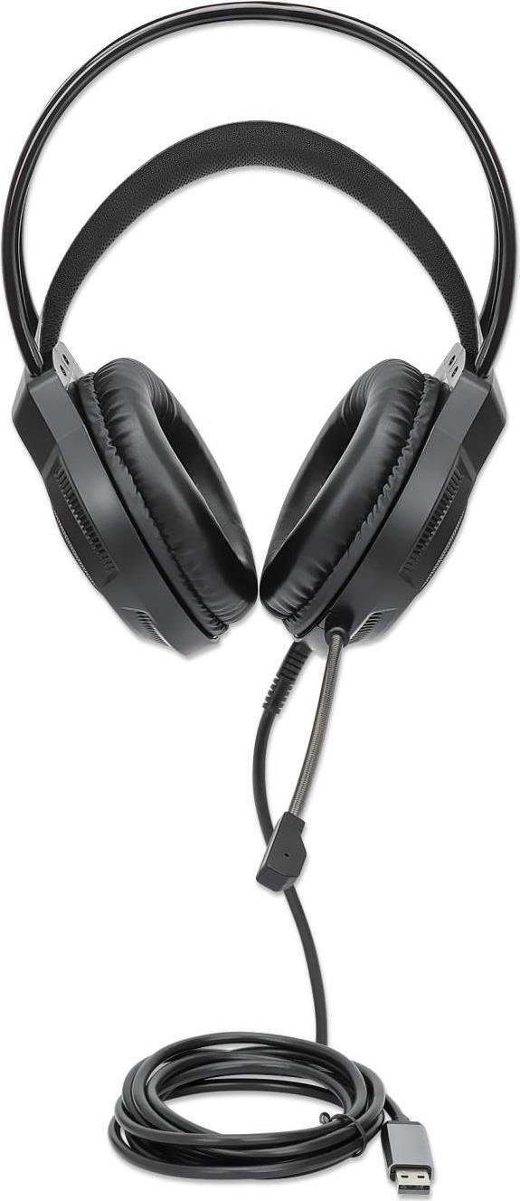 Das Manhattan RGB LED Over-Ear USB Gaming-Headset ist konzipiert für lange, kompetitive Gamingsessions sowie Multimedia- und Musik. Es vereint Tragekomfort mit stylischem Look.