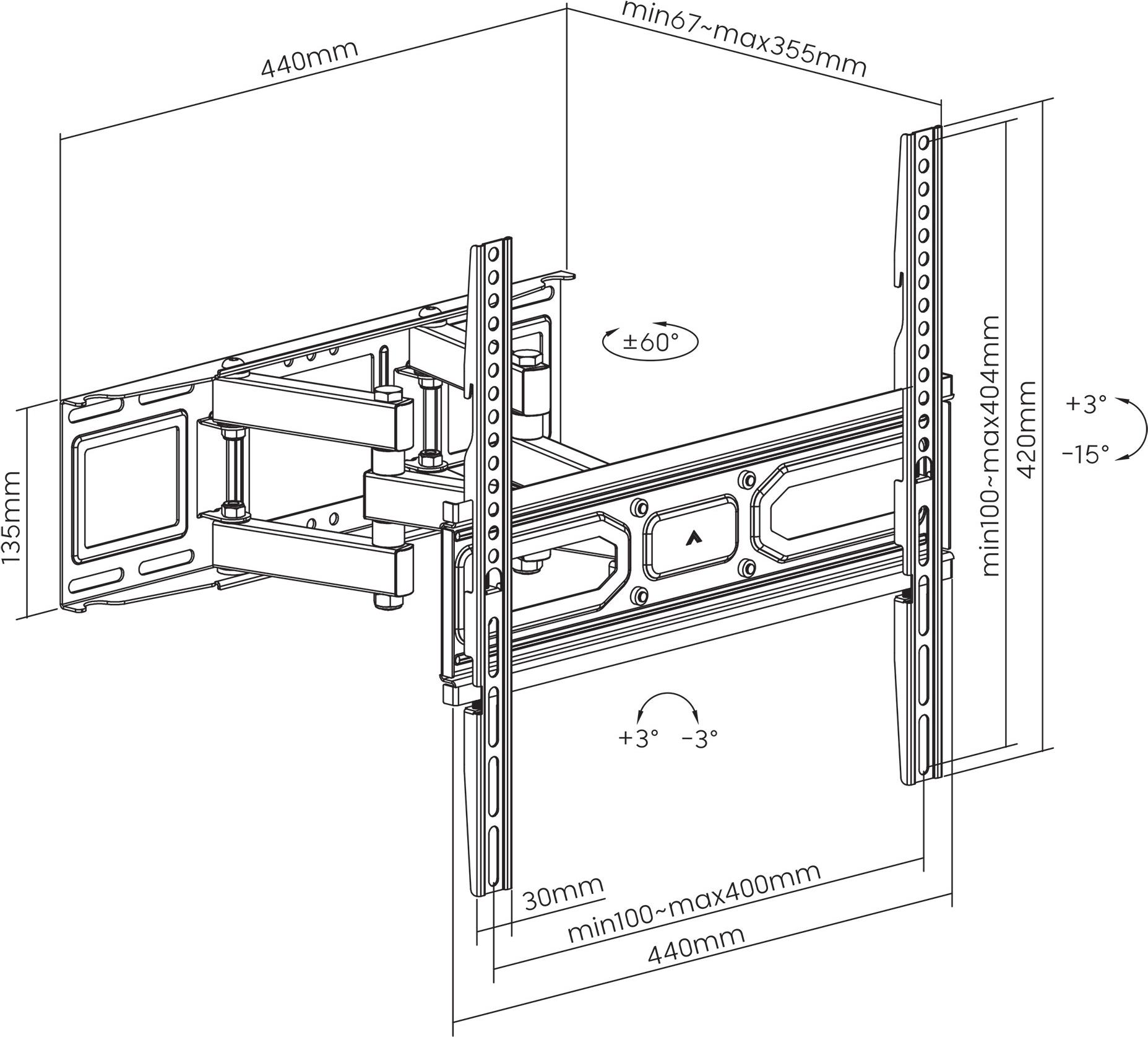 TV-Wandhalterung, Full Motion/vollbeweglich und horizontal nachjustierbarAnsteckbare WasserwaageMontagematerial und Anleitung |