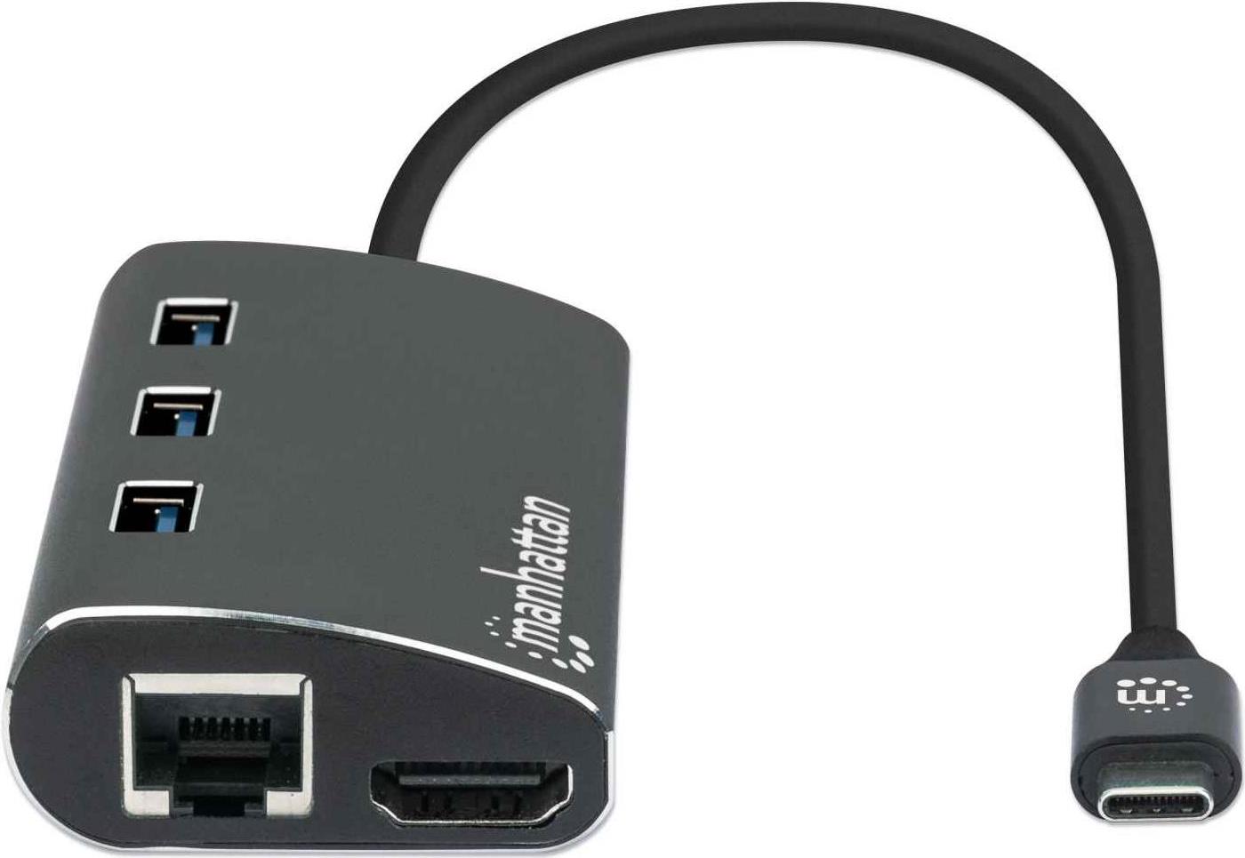 | Produktbeschreibung | Manhattan USB-C Dock/Hub with Card Reader, Ports (x6): Ethernet, HDMI, USB-A (x3) and USB-C, With Power Delivery (100W) to USB-C Port (Note additional USB-C wall charger and USB-C cable needed), Aluminium, Black, 3 Year Warranty - Dockingstation - USB-C 3.2 Gen 1 - HDMI - GigE |