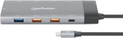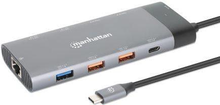 Steigern Sie Ihre Produktivität mit Ihrem PC, Mac oder Tablet mit dieser äußerst vielseitigen Dockingstation von Manhattan. Sie hilft Ihnen beim Multitasking auf zwei UHD-HDMI-Monitoren zur gleichen Zeit. Mit fünf SuperSpeed-USB-A-Anschlüssen, über die kompatible Geräte schnell angeschlossen und aufgeladen werden können, sowie einem SuperSpeed-USB-C-Datenübertragungsanschluss für den Anschluss von Geräten mit hoher Bandbreite können Sie die meisten Konnektivitätsanforderungen erfüllen. Der mitgelieferte 10/100/1000-Ethernet-Anschluss mit automatischer Erkennung unterstützt Sie bei der Anbindung an Ihr kabelgebundenes Netzwerk, und der Power-Delivery-Eingang (PD) mit einer Leistung von bis zu 100 W sorgt dafür, dass alle USB-Geräte, die an das Dock angeschlossen werden, mit Strom versorgt werden.Die beiden HDMI-Anschlüsse an der Basis der Dockingstation ermöglichen Ihnen Multitasking auf mehreren HDMI-Monitoren gleichzeitig. Fügen Sie einen HDMI-Monitor zu Ihrem Laptop-Display hinzu, um 8K-Bilder mit 30 Hz anzuzeigen, oder fügen Sie zwei Monitore hinzu, um Auflösungen bis zu 4K mit 60 Hz zu erreichen. Unter Windows werden die Modi \"Mirror\" und \"Fully Extended\" unterstützt, d. h. Sie können unterschiedliche Bilder und Videos auf Ihrem Laptop und zwei anderen Monitoren anzeigen. Auf dem Mac unterstützt es Mirror oder Extended Mirror, was bedeutet, dass Sie ein Bild/Video auf Ihrem Laptop und die gleichen Bilder auf zwei anderen Monitoren haben können.Mit sechs USB-Anschlüssen für Mäuse, Tastaturen und Flash-Laufwerke sorgt diese Dockingstation dafür, dass all Ihre nützlichen Peripheriegeräte für Sie arbeiten. Von den fünf USB-A-Anschlüssen haben zwei Übertragungsgeschwindigkeiten von bis zu 10 Gbit/s und drei von bis zu 5 Gbit/s, wobei alle Anschlüsse eine Ladeleistung von bis zu 2,5 W bieten. Ein USB-C-Datenübertragungsanschluss bietet Übertragungsgeschwindigkeiten von bis zu 10 Gbit/s. Außerdem bietet der Gigabit-RJ45-Anschluss eine zuverlässige kabelgebundene Netzwerkverbindung, die bei den meisten modernen Ultrabooks und MacBooks fehlt.Der mitgelieferte USB-C-PD-Anschluss liefert bis zu 85 W, um Ihr Notebook aufzuladen, während Sie gleichzeitig Ihre anderen mobilen Geräte wie Smartphones oder Tablets über die USB-A-Anschlüsse aufladen. Die Power-Delivery-Funktion ermöglicht zudem ein schnelleres Aufladen als bei Standard-Ladegeräten, da sie den Strombedarf kompatibler Geräte ermittelt und mit der schnellsten und sichersten Rate liefert.Schließen Sie jedes Smartphone mit Android 9 und höher an, das die Videoausgabe über USB-C DP Alt Mode unterstützt, um Ihre Apps und Medien noch mehr zu genießen. Sehen Sie sich ein Video auf Ihrem Monitor an oder blättern Sie durch die Folien Ihrer Präsentation - alles von Ihrem Smartphone aus.Das robuste Aluminiumgehäuse macht diesen Multiport-Adapter zum perfekten Reisebegleiter. Trotz seiner umfangreichen Anschlussmöglichkeiten ist er immer noch kompakt genug, um zusammen mit Ihrem Hauptgerät in Ihren Rucksack oder Ihre Computertasche zu passen.