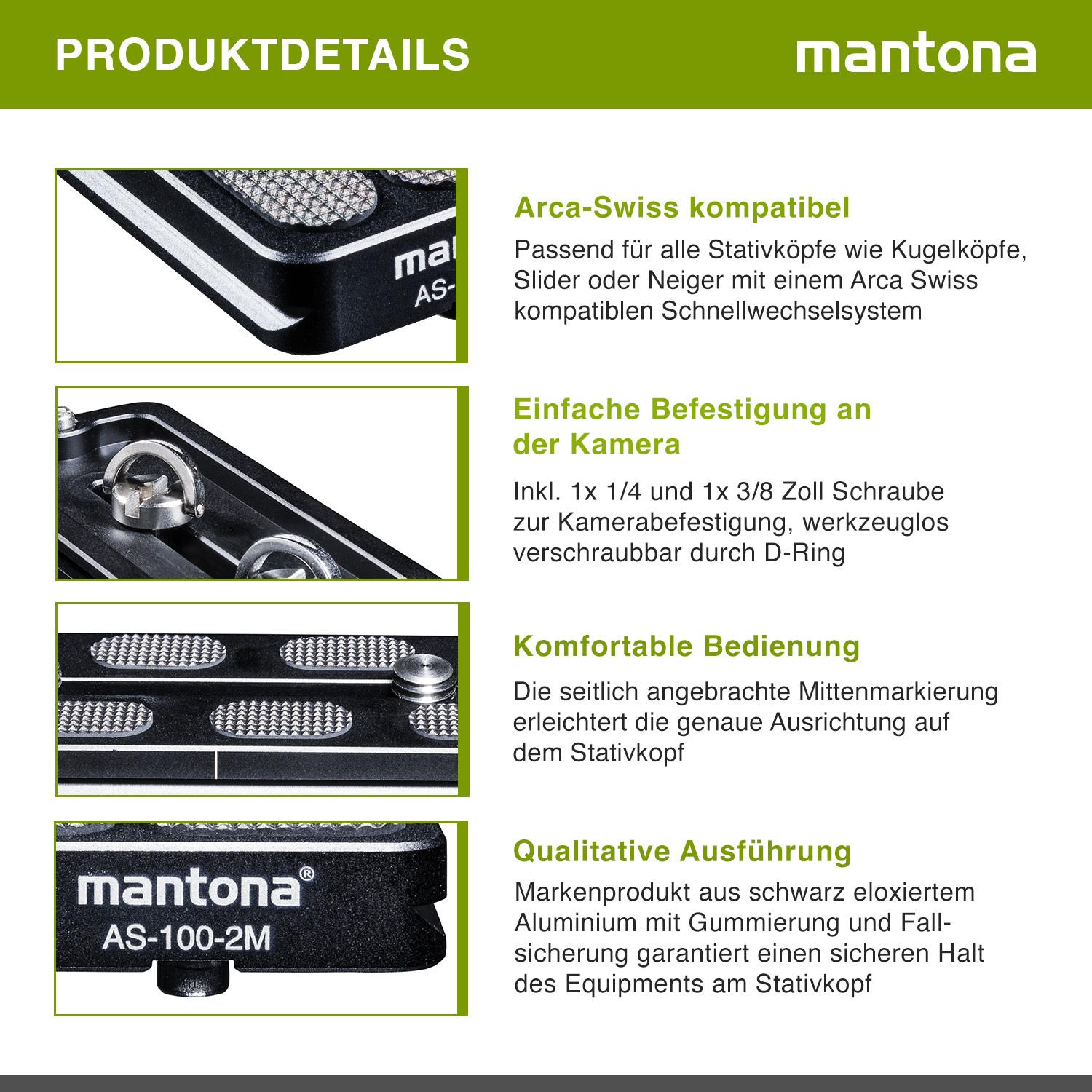 Walimex Mantona AS-100-2M Schnellwechselplatte Arca-Swiss kompatibel, 100x38mm mit Schrauben und Mittenmarkierung (1021464)