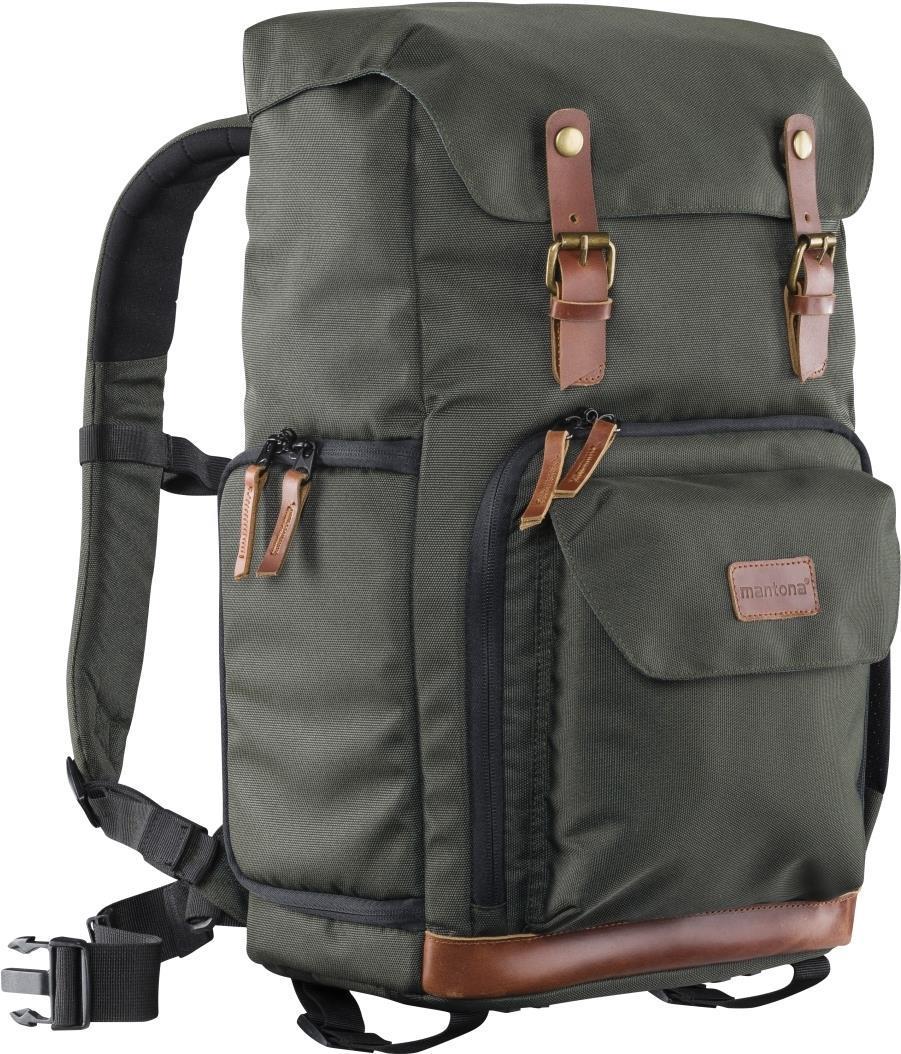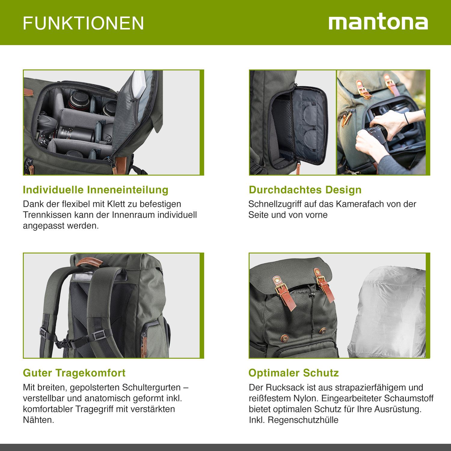 Walimex Mantona Luis Retro Fotorucksack (mit Echtleder-Applikationen, inkl. Regenschutzhülle, flexible Einteilung und Laptopfach, geeignet für 1x DSLR-Kamera, 3x Objektive und diverses Fotozubehör) grün (1021343)