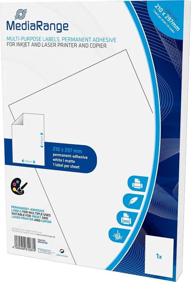 MediaRange - Matt - permanenter Klebstoff - Mattes Weiß - A4 (210 x 297 mm) 50 Etikett(en) (50 Bogen x 1) Rechtwinklige Mehrzweck-Etiketten (MRINK140)