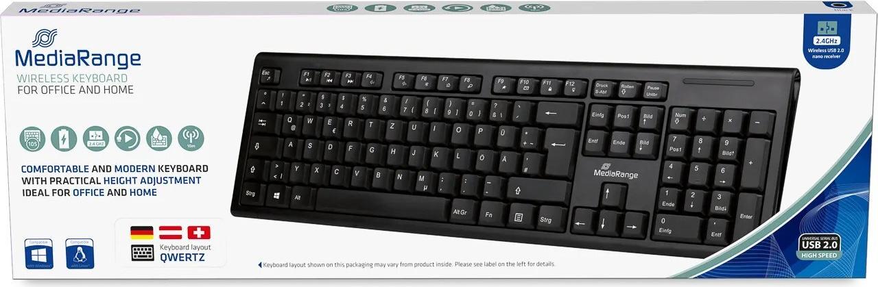 MediaRange Eingabegeräte eignen sich ideal für sämtliche Anwendungen im Büro oder Zuhause. Die kabellose Tastatur lässt sich schnell und einfach per USB Empfänger verbinden und ist mit sämtlichen gängigen Betriebssystemen kompatibel und sofort einsatzbereit. Mit über 8 Millionen Tastenanschlägen und Spritzwasserschutz, sind die Tastaturen ideal vor äußeren Einwirkungen des Alltags geschützt. Die praktische Höhenverstellung sorgt zusätzlich für mehr Schreibkomfort.