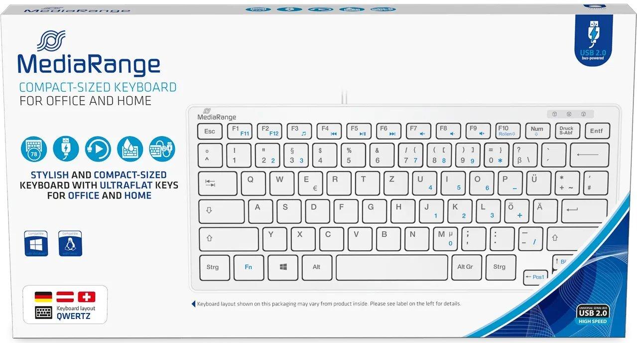MediaRange Eingabegeräte eignen sich ideal für sämtliche Anwendungen im Büro oder Zuhause. Die Tastaturen lassen sich schnell und einfach per USB-Anschluss verbinden und sind mit sämtlichen gängigen Betriebssystemen kompatibel und sofort einsatzbereit. Mit über 5 Millionen Tastenanschlägen und Spritzwasserschutz, sind die Tastaturen ideal vor äußeren Einwirkungen des Alltags geschützt. Die praktische Höhenverstellung sorgt zusätzlich für mehr Schreibkomfort.Hauptmerkmale