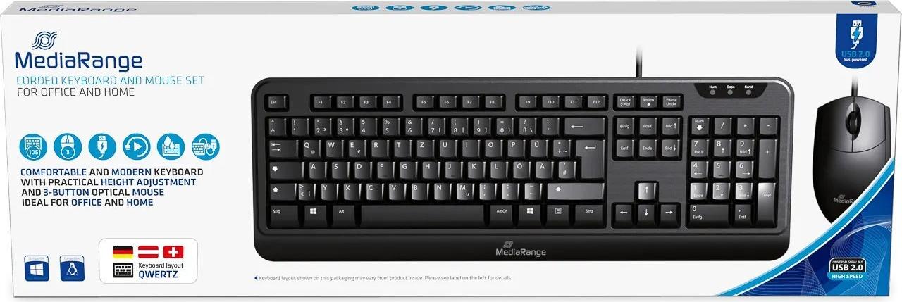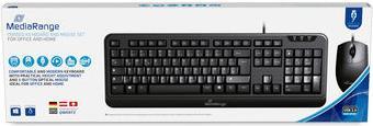 MediaRange Eingabegeräte eignen sich ideal für sämtliche Anwendungen im Büro oder Zuhause. Das Set, bestehend aus kabelgebundener Tastatur und Maus, lässt sich schnell und einfacher USB-Anschluss verbinden und ist dank Plug & Play mit sämtlichen gängigen Betriebssystemen kompatibel und sofort einsatzbereit. Mit über 5 Millionen Tastenanschlägen und Spritzwasserschutz, sind MediaRange Tastaturen ideal vor äußeren Einwirkungen des Alltags geschützt. Die praktische Höhenverstellung sorgt zusätzlich für mehr Schreibkomfort.Hauptmerkmale
