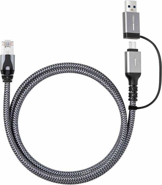 Netzwerkverbindung ohne Netzwerkbuchse mit einem kombinierten Kabel. Dieses Kabel verbindet Geräte, die nur über USB-C- oder USB-A-Anschlüsse verfügen, mit einem Hochgeschwindigkeitsnetzwerk und eliminiert die Notwendigkeit eines sperrigen RJ45-Adapters.