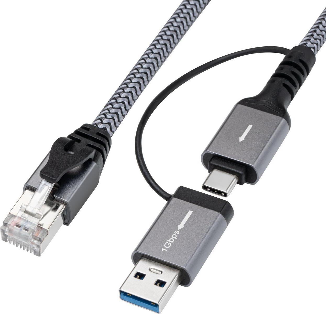 Netzwerkverbindung ohne Netzwerkschnittstelle mit einem kombinierten Kabel. Dieses Kabel verbindet Geräte, die nur über USB-C- oder USB-A-Anschlüsse verfügen, mit einem Hochgeschwindigkeitsnetzwerk und eliminiert die Notwendigkeit eines sperrigen RJ45-Adapters.