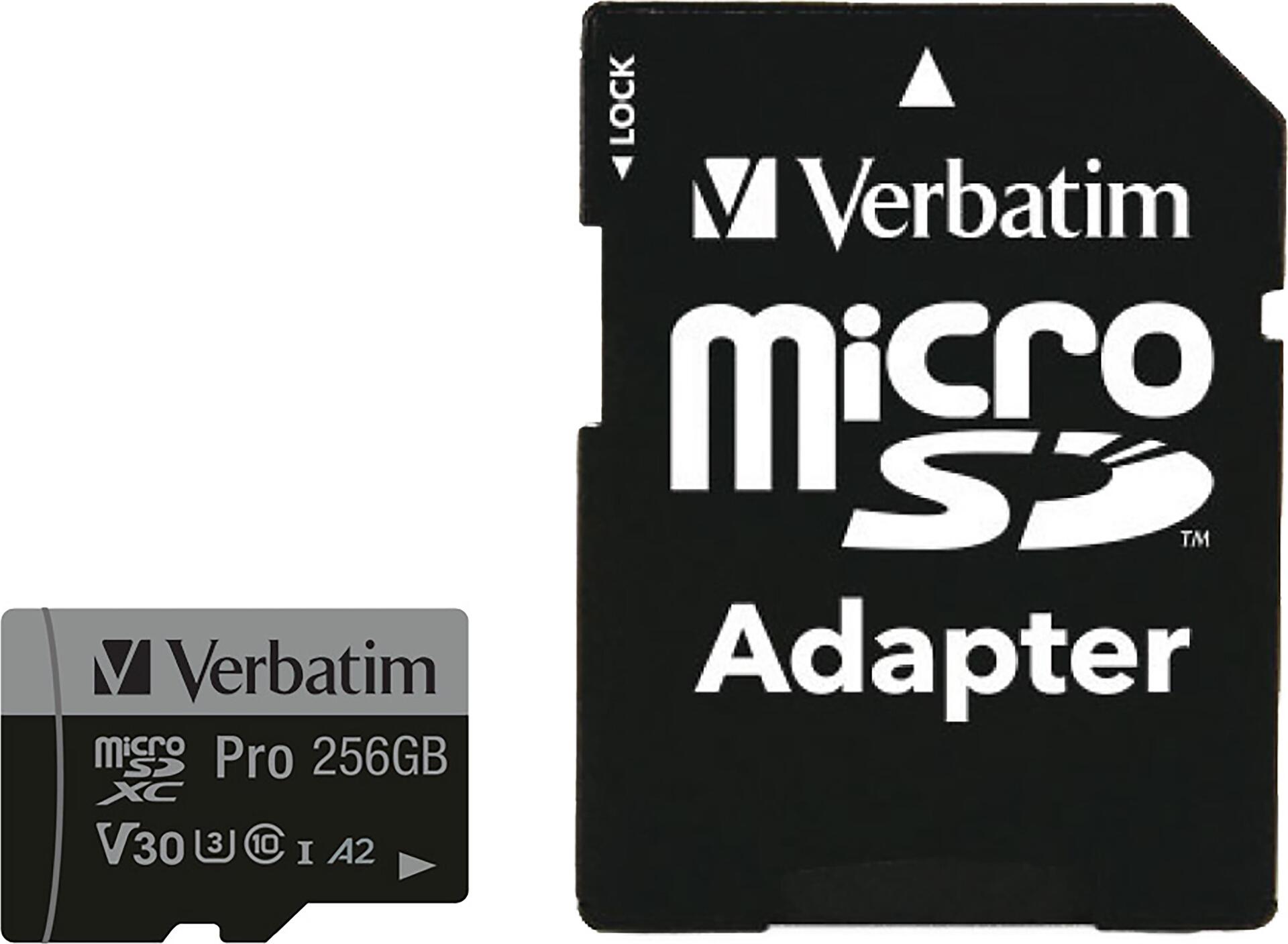 Verbatim PRO U3 - Flash-Speicherkarte (microSDXC-an-SD-Adapter inbegriffen) - 256GB - A2 / UHS-I U3 / Class10 - microSDXC UHS-I (47045)